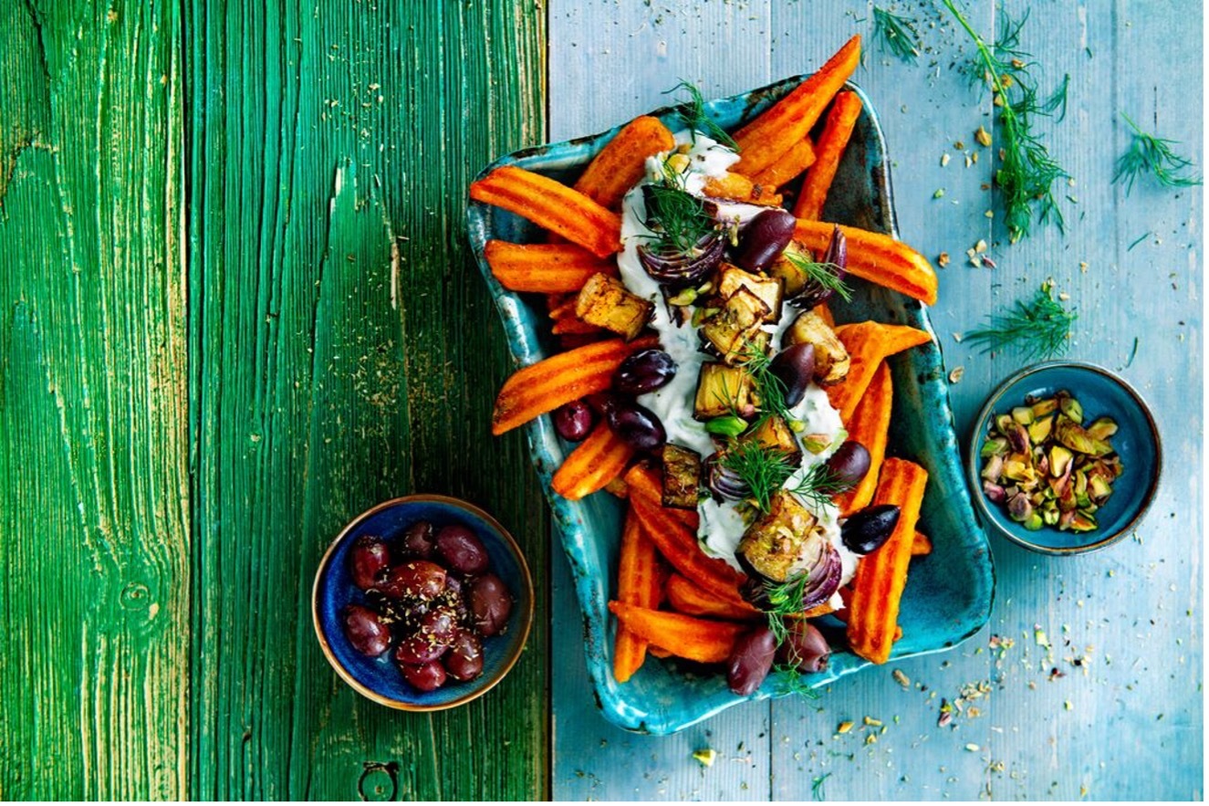 4. Na gorące frytki nałóż krem z fety, dodaj pieczony bakłażan, cebulę, oliwki, pistacje i świeży koperek. Możesz dodatkowo ozdobić pestkami granatu.